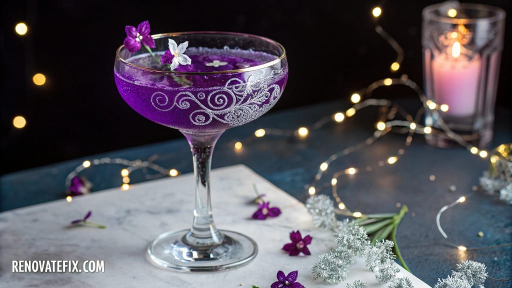Purple-hued plum liqueur swirls with prosecco and elderflower essence, crafting dreams in liquid form.