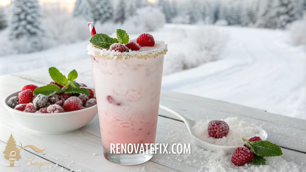 Fresh cream floats atop like winter’s first snow, while red-striped candy garnish adds playful charm.