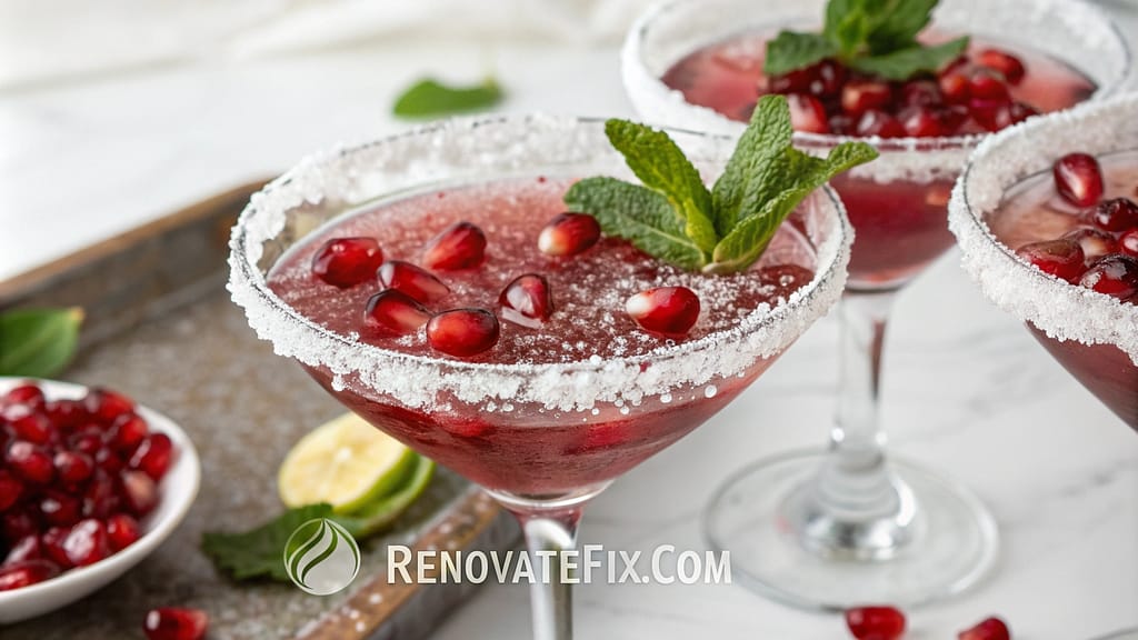 Fresh pomegranate seeds cascade while cinnamon sugar dusts rim. Star anise floats atop.