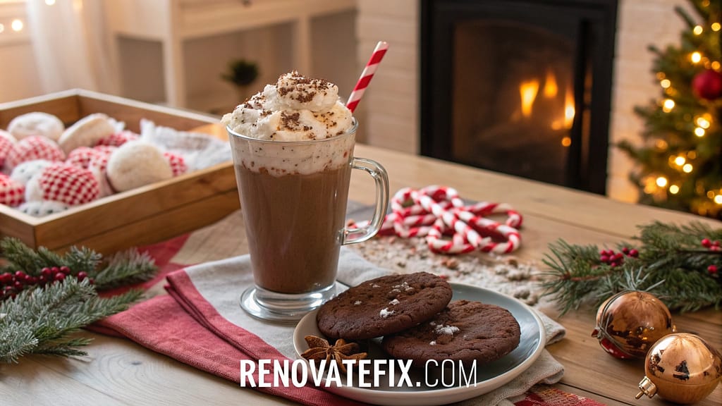 Chocolate-dipped cookies rest alongside, perfect for winter evenings.