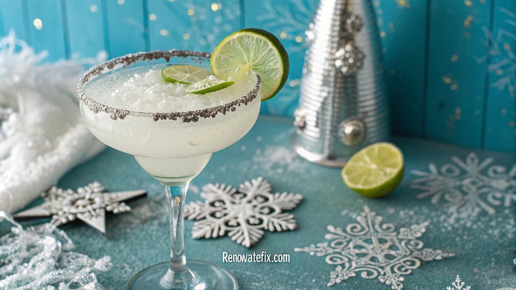 Coconut flakes dust rim like fresh snow while silver edible glitter swirls within.