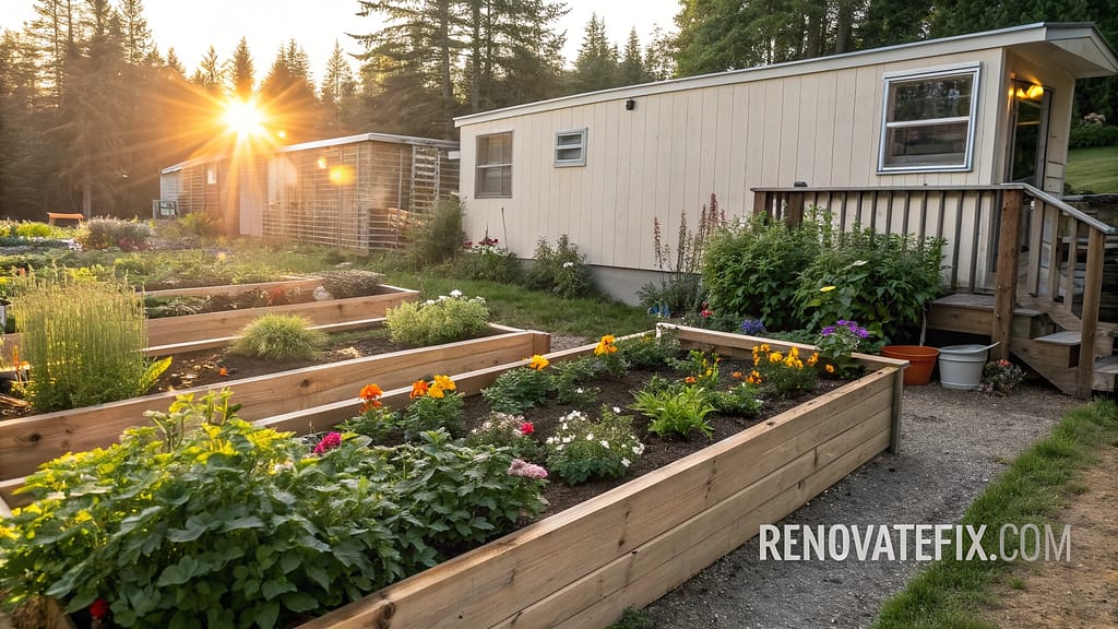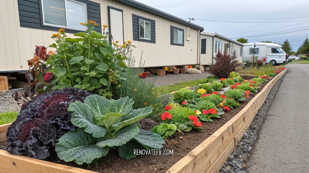 Build elevated planting areas around your mobile home’s perimeter using timber, stone, or composite materials.