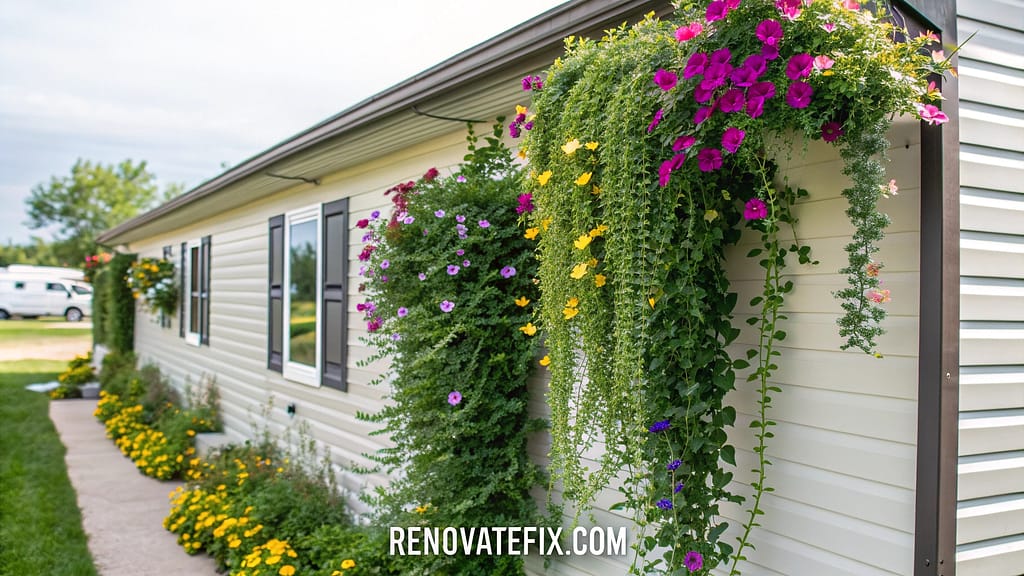 These space-saving solutions allow climbing vegetables, flowering vines, or cascading ornamentals to flourish without consuming valuable ground space around your mobile home.