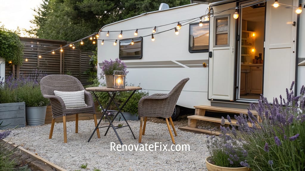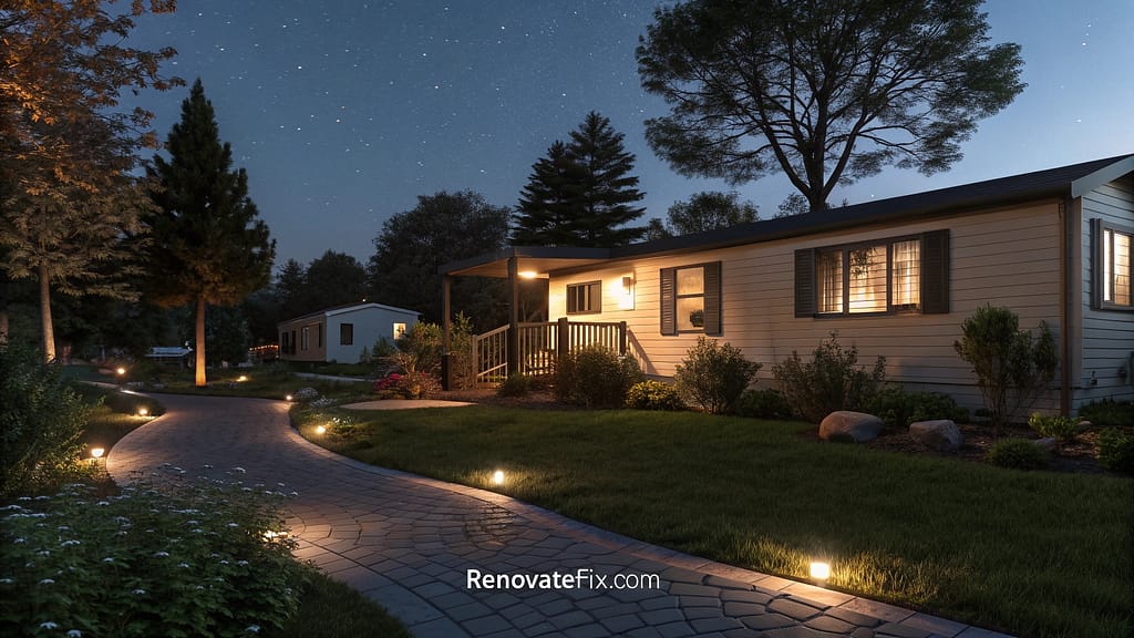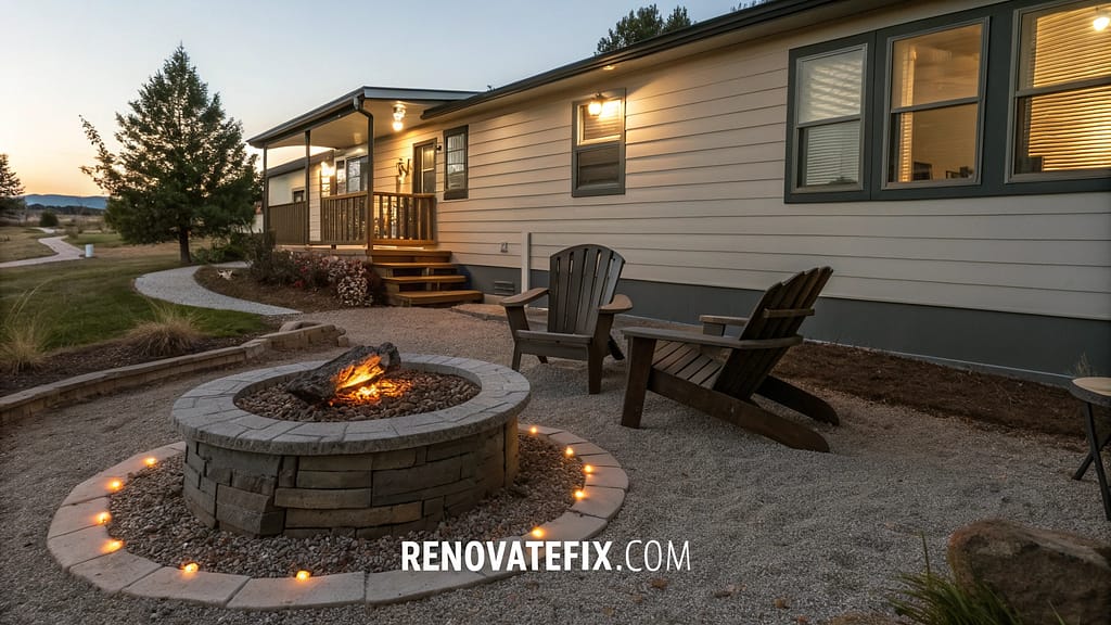 Establish an intimate outdoor dining space using compact furniture, potted plants, and mood lighting near your mobile home’s entry or side yard.