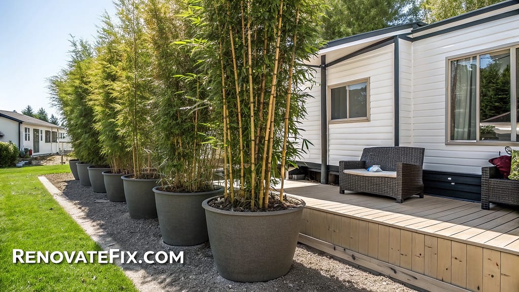 Plant non-invasive bamboo varieties in large containers positioned strategically to block unwanted views or create private outdoor rooms around your mobile home.