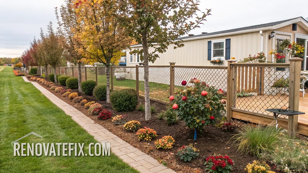 Plant strategic groupings of columnar evergreens, ornamental grasses, or flowering shrubs to establish natural privacy barriers around your mobile home that look more inviting than manufactured fencing options.