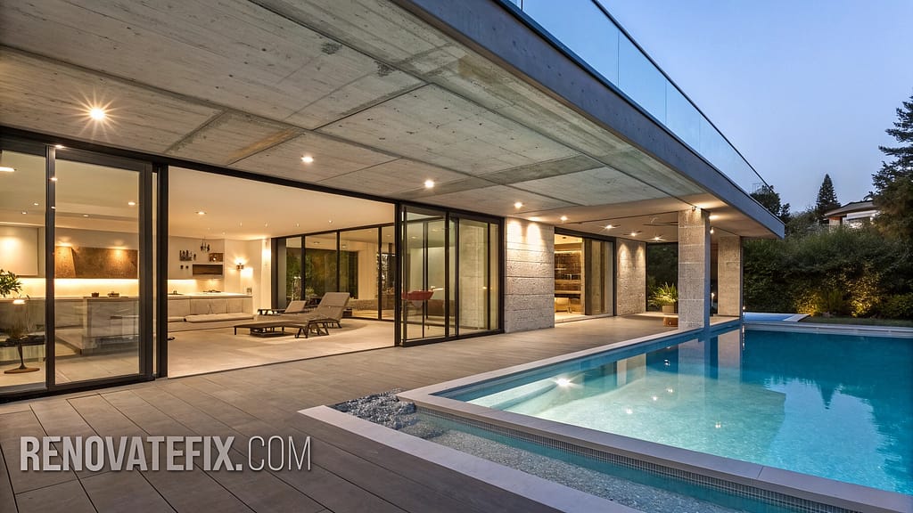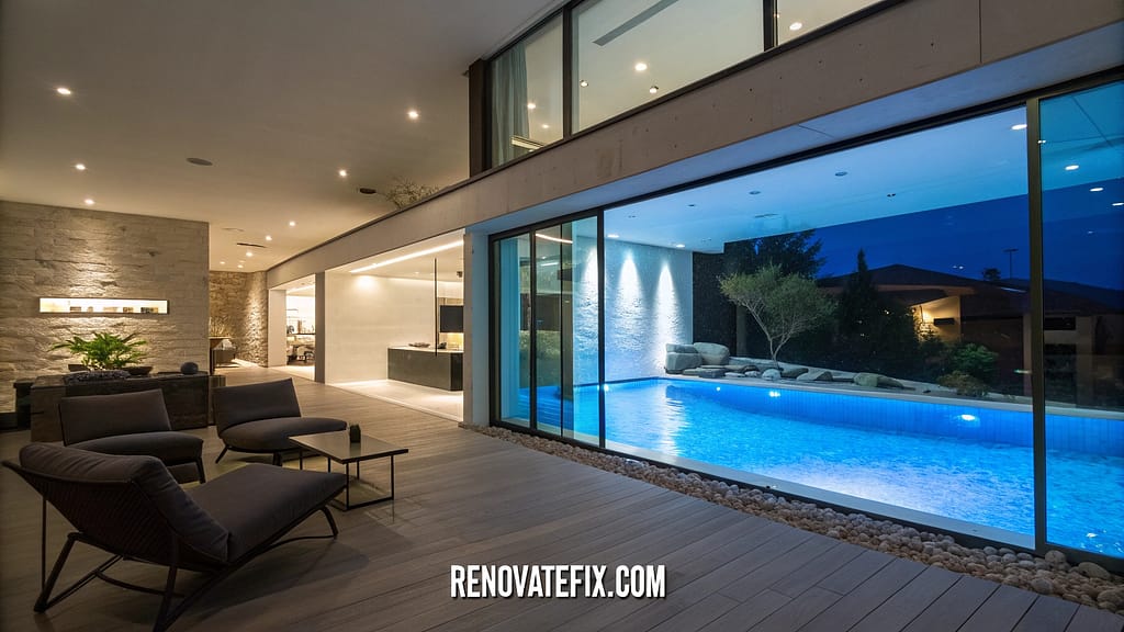 Matching floor materials inside and out strengthen visual connection while pool heating systems maintain comfortable temperatures during cooler seasons.