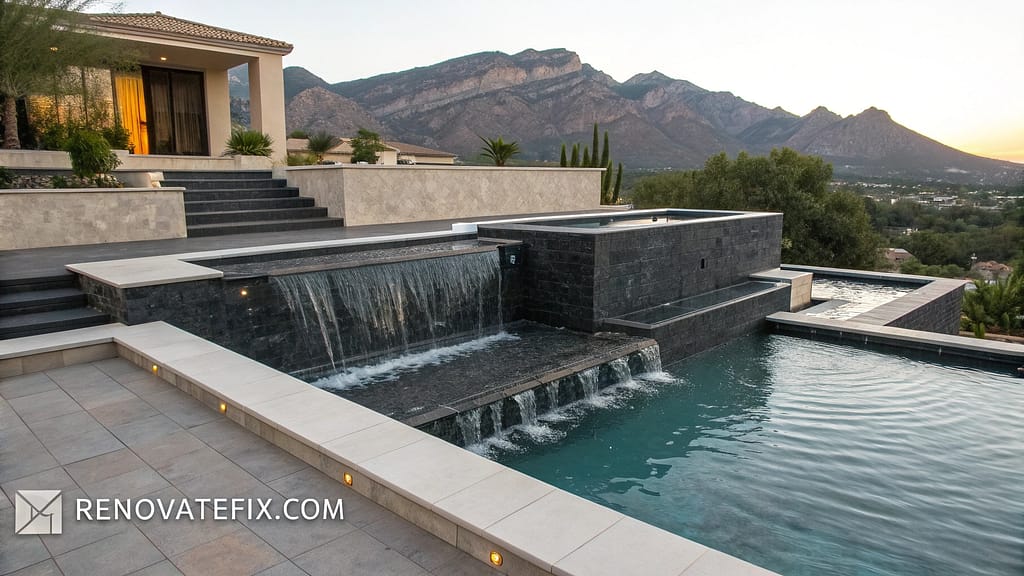 Architectural concrete steps or natural stone formations guide water journeys while providing numerous seating opportunities along progression pathway.