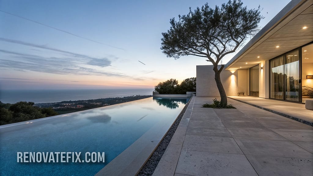 Experience visually striking water management where entire pool perimeter acts as overflow edge creating perfectly flat mirror-like surfaces.