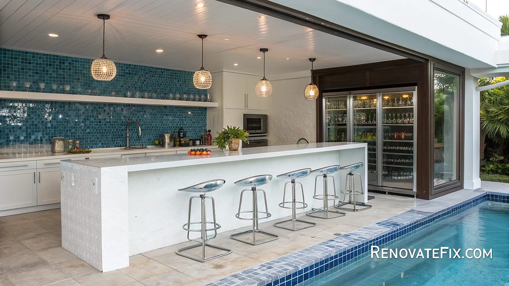 Built-in underwater seating accommodates guests comfortably while conversing with those preparing drinks or snacks behind counter.