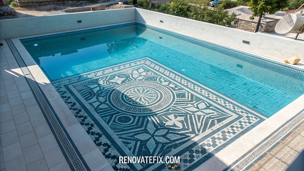 Elevate standard pool floors into captivating visual masterpieces through custom tile arrangements creating underwater art galleries.