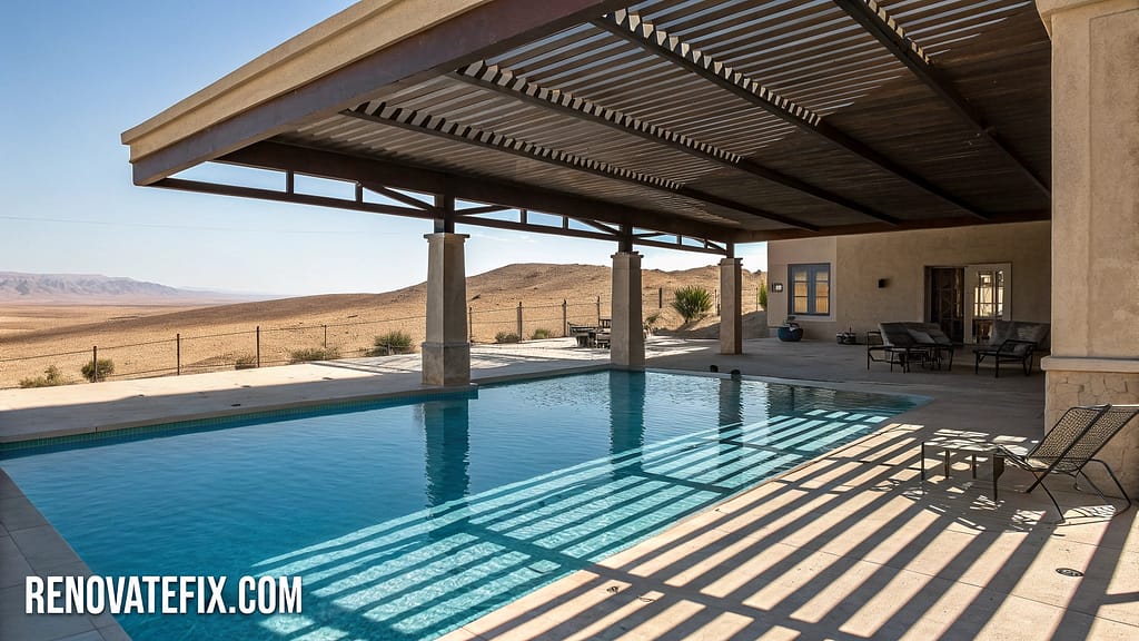 Strategically positioned beams create fascinating shadow patterns across water surface throughout day while providing relief from direct sunlight.