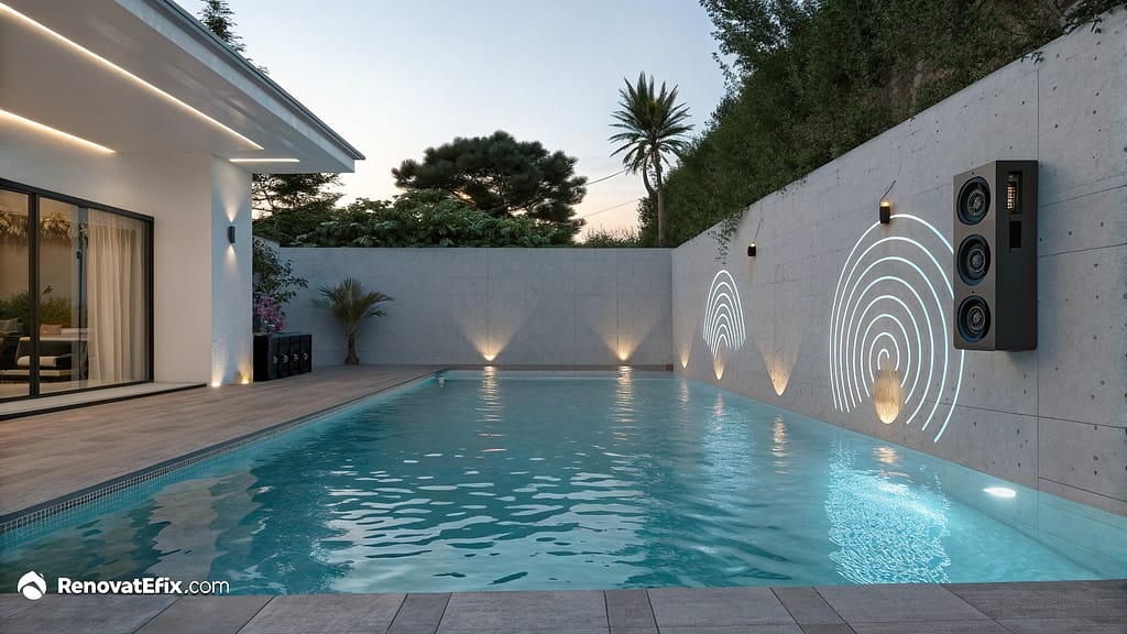 Sound systems remain discretely hidden within landscaping elements delivering cinema-quality audio without disrupting clean aesthetic lines of overall pool design.