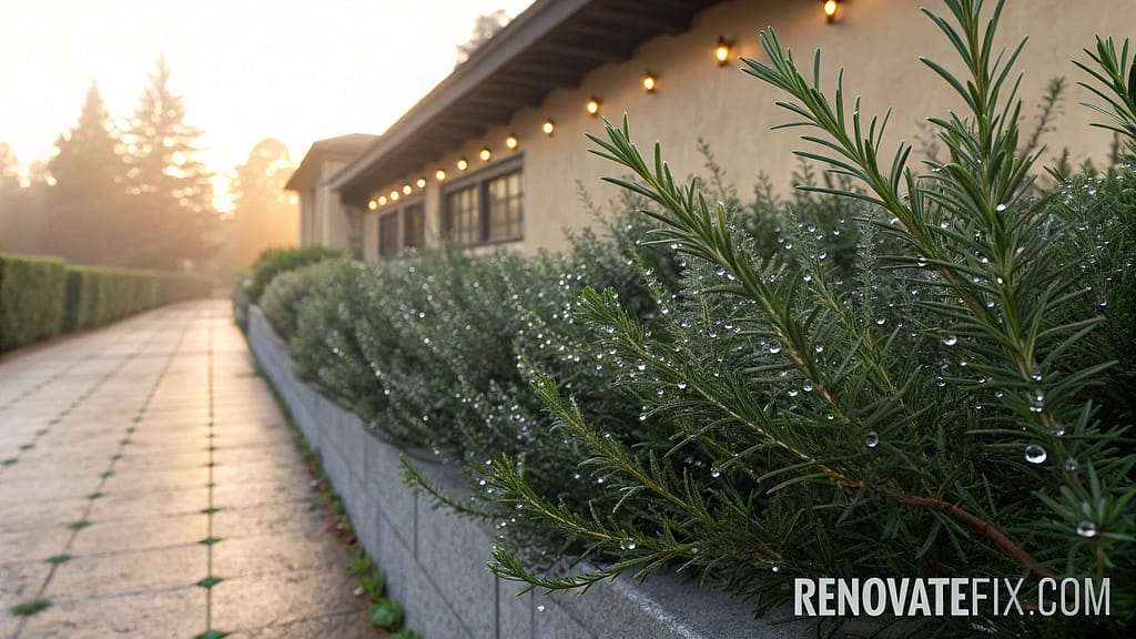Upright rosemary plants formed into living walls create aromatic boundaries that naturally repel mosquitoes while providing fresh herbs for cooking, combining practicality with protection in vertical gardening spaces.
