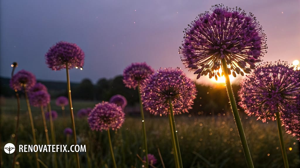Purple-blooming allium bulbs planted in mass formations offer spring protection against early-season mosquitoes while creating dramatic spherical flower displays throughout your garden beds.