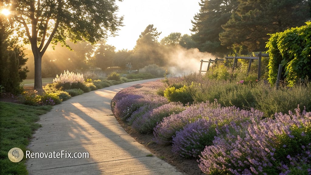 Fragrant lavender plants arranged along walkways serve dual purposes as both stunning landscape elements and natural insect deterrents, offering pleasant scents for humans while creating zones mosquitoes avoid.
