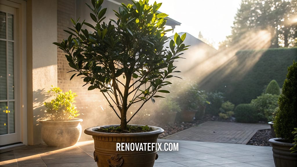 Potted bay laurel plants positioned near seating areas release strong aromatic oils that repel flying insects while providing fresh leaves for cooking purposes.