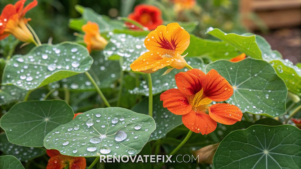 Colorful nasturtium flowers spreading across ground areas emit natural pest-deterrent compounds while creating vibrant carpets of edible blooms throughout your garden spaces.