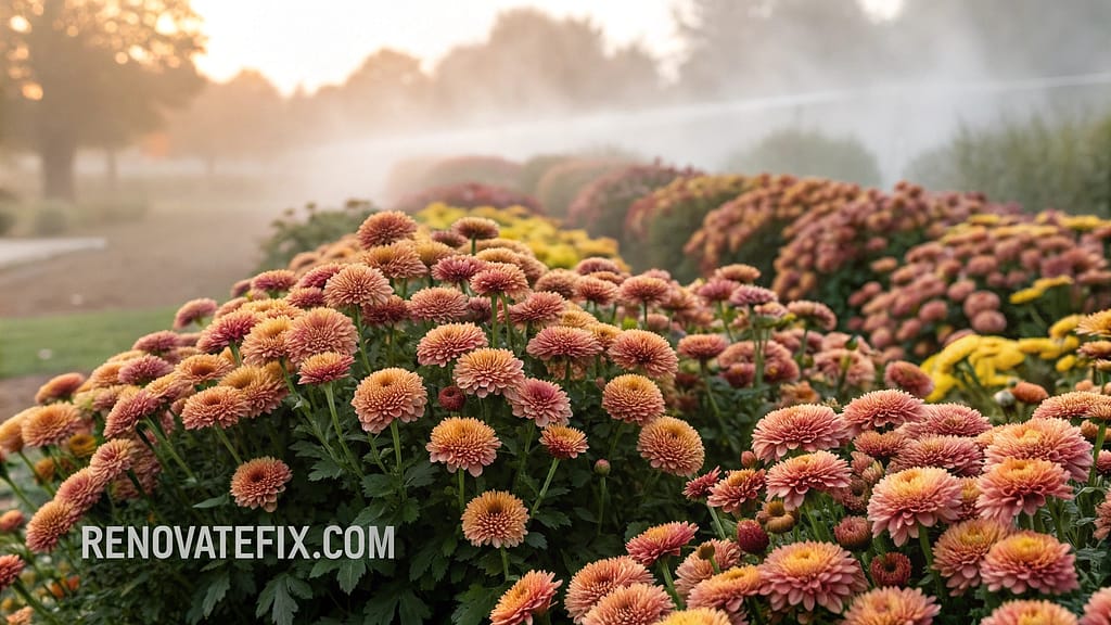 Pyrethrum-rich chrysanthemums planted in sweeping beds provide natural insecticide properties while creating stunning autumn displays, offering late-season protection when other plants decline.