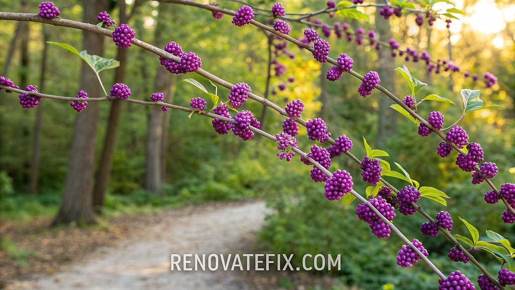 Purple berry clusters follow subtle flowers on arching branches, creating visual interest while naturally repelling mosquitoes through unique compounds.