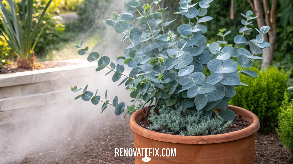 Growing rapidly into small tree form, eucalyptus works wonderfully in large containers where size remains manageable through seasonal pruning.