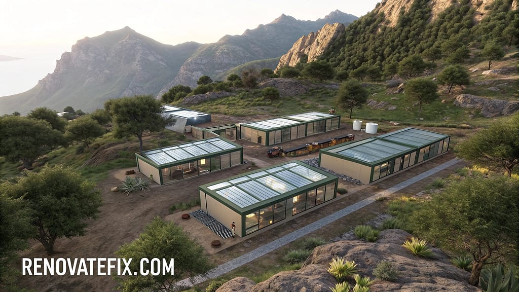 Individual prefabricated units arranged in flowing organic pattern create compound that adapts perfectly to irregular mountain terrain.