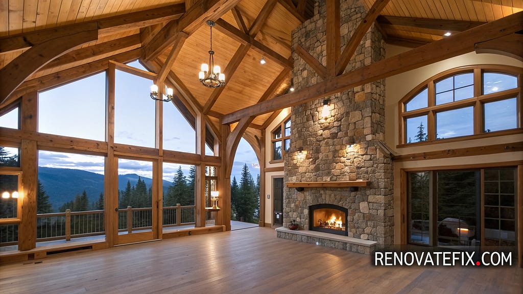 Double-height great room creates gathering space beneath massive roof trusses, while stone hearth anchors living area.