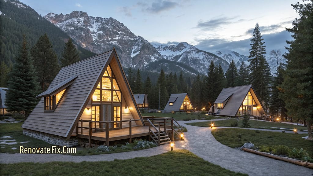Cluster of compact A-frame structures creates community feeling while providing separate spaces for different activities or guests.