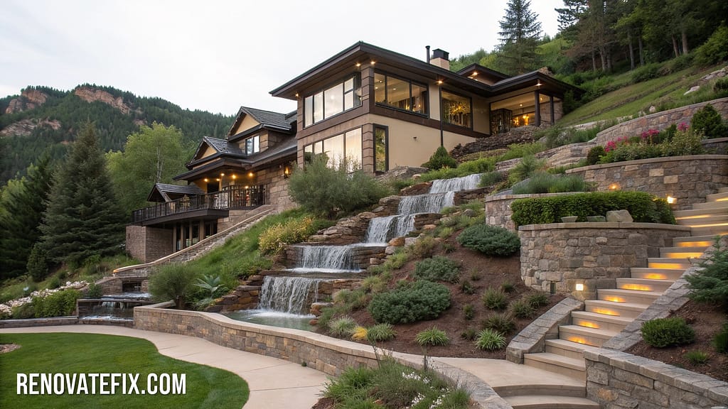 Water features flow alongside exterior staircases, mimicking mountain streams while providing pleasant auditory backdrop.