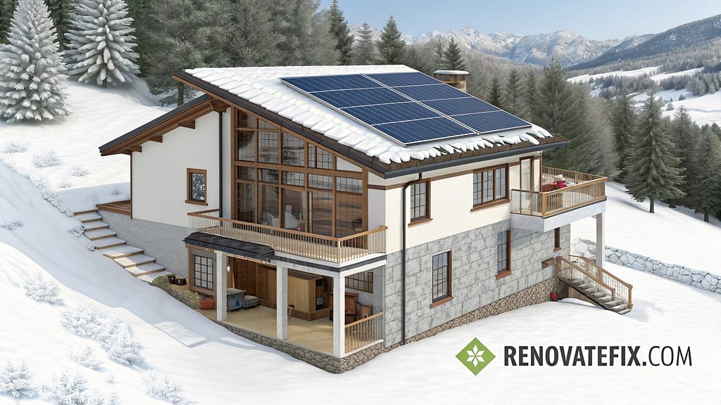 Massive solar array crowns south-facing roof plane, generating sufficient electricity for entire property despite shortened winter days.