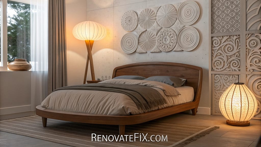 Strategically placed textural elements like knitted blankets, sheepskin throws, and woven wall hangings add visual intrigue without disrupting calm.