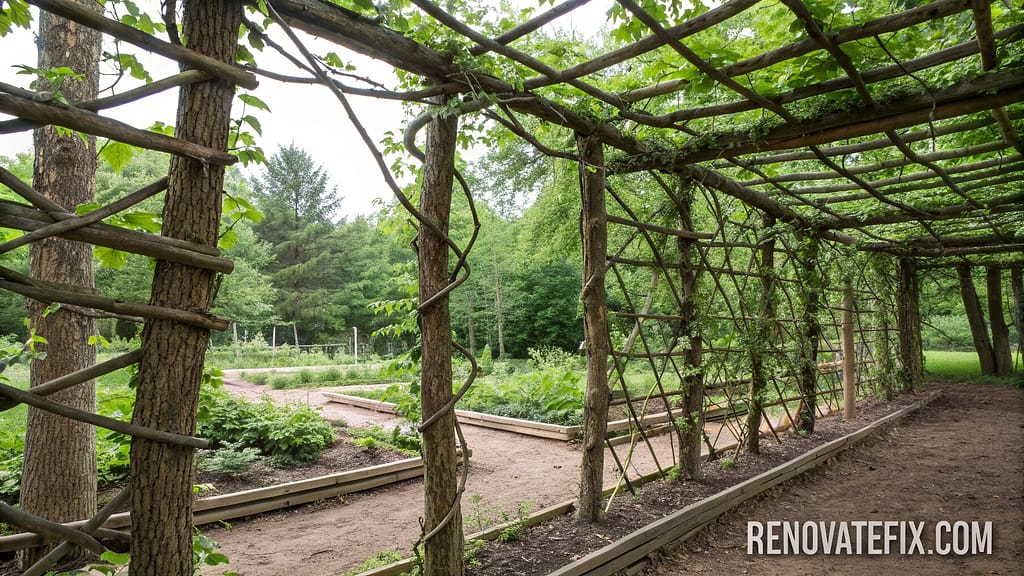Select varied driftwood sections, secure with hidden screws or wire at connecting points, and anchor completed frames firmly alongside pea rows.