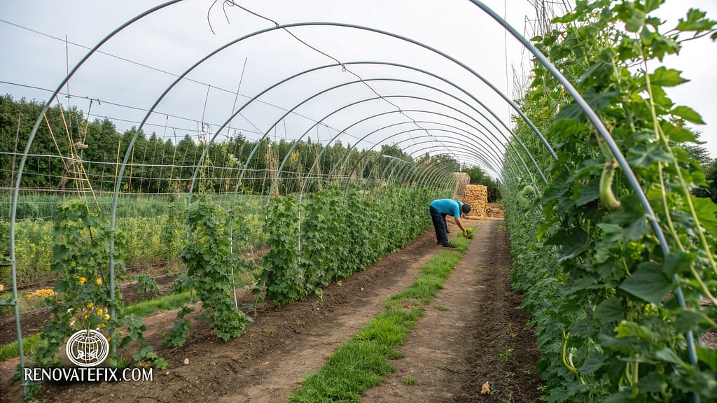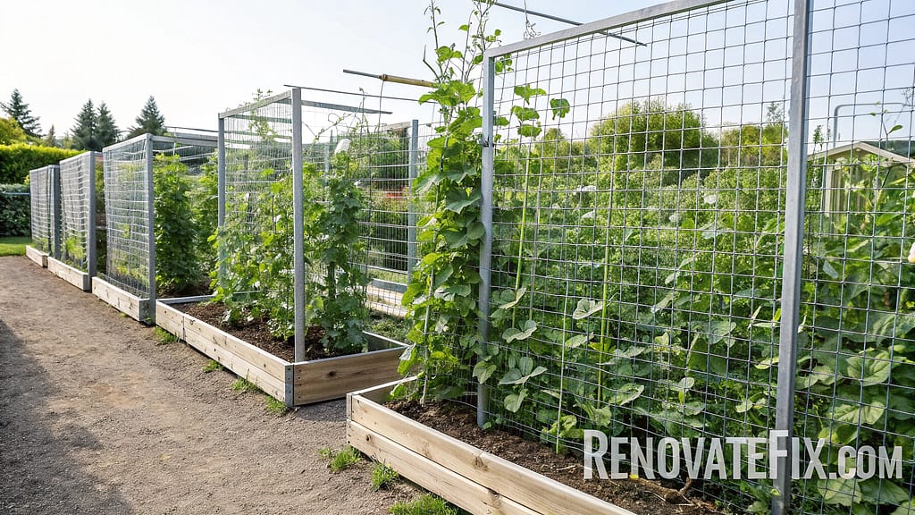 Concrete reinforcing mesh panels installed vertically along garden rows function as productive living walls between garden sections.