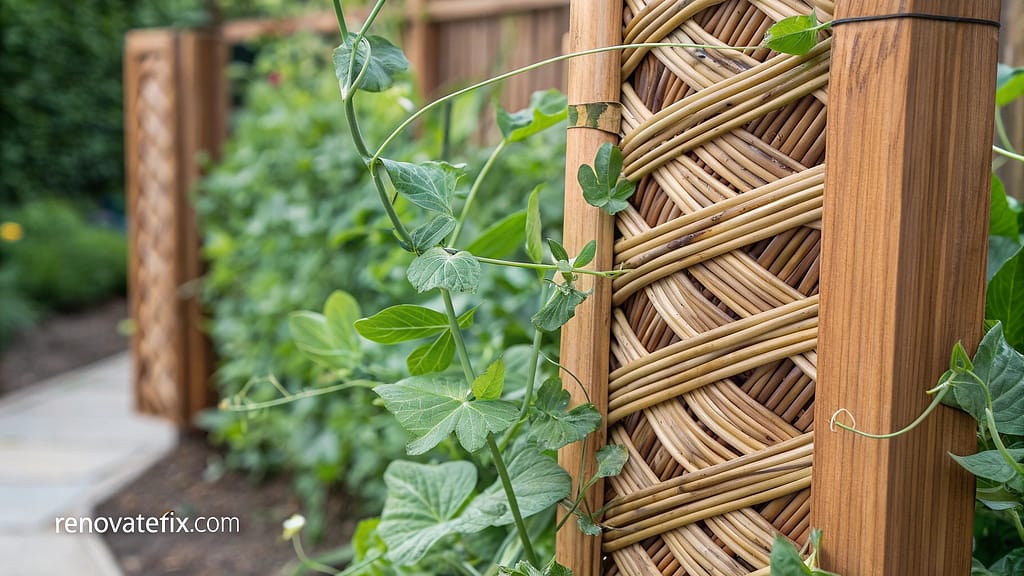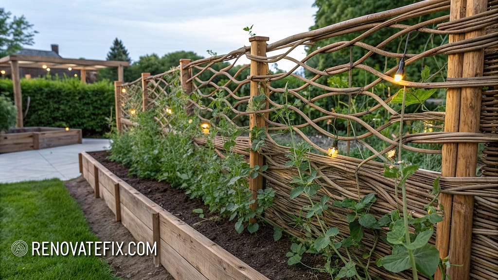 Handwoven wicker panels installed between posts deliver natural textural supports perfect for delicate pea tendrils.
