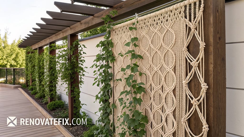 Craft macramé panels using weather-resistant rope, incorporating various knot patterns that provide numerous attachment points for plant tendrils.