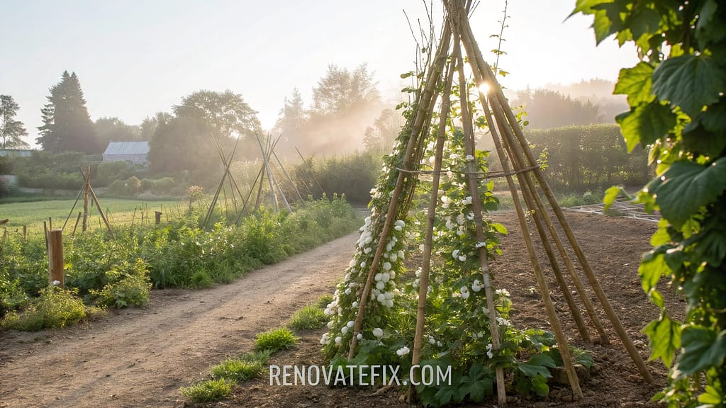 Add horizontal twine between poles to provide additional climbing surfaces for tendrils to grasp as they reach skyward, forming a natural green pyramid that stands as an architectural element within garden rows.