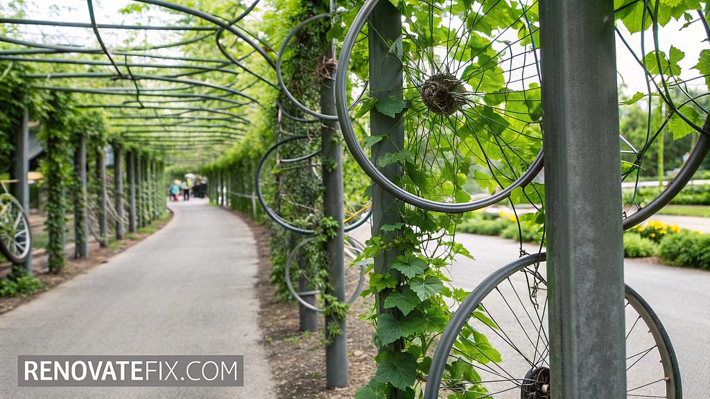 Pea tendrils eagerly grasp spokes and rims, forming spiral patterns of growth that showcase sustainability through creative reuse while providing excellent support for vigorous climbing varieties.