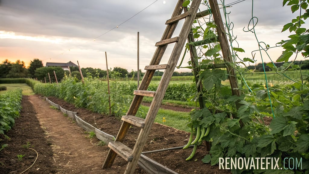 An old wooden ladder, stationed horizontally above pea seedlings, delivers practical climbing support with rustic charm.