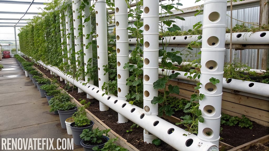 Drilled PVC pipes mounted vertically combine growing support with water distribution innovation.