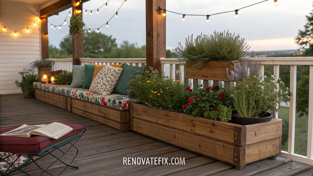Commission custom benches with built-in planter sections or retrofit existing pieces with removable planting troughs that bring greenery into intimate proximity with porch occupants.
