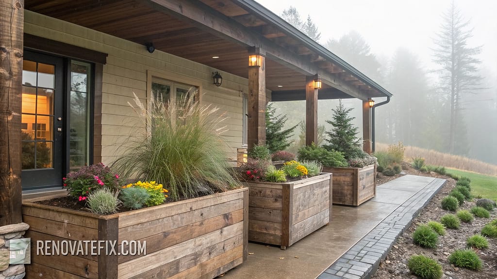 Construct robust, architectural planters from reclaimed railway ties or their modern equivalents to bring rustic industrial charm to your porch.