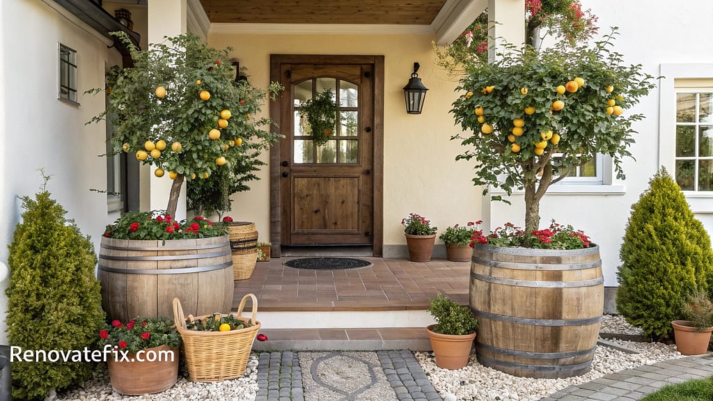 Frame your porch entrance with productive plants that offer both ornamental beauty and culinary benefits.