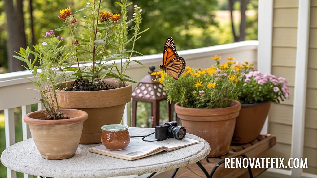 Incorporate small water features, nesting materials, or specialized structures like butterfly puddling stations among your containers.