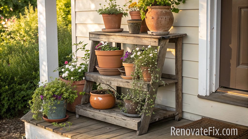 Old watering cans, wooden toolboxes, galvanized buckets, or even worn boots can become charming vessels for greenery.