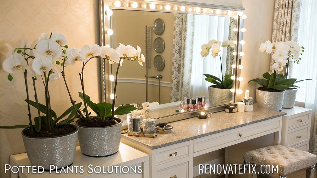 Mercury glass containers cradle orchids and air plants, adding glamour to grooming spaces through reflective surfaces.
