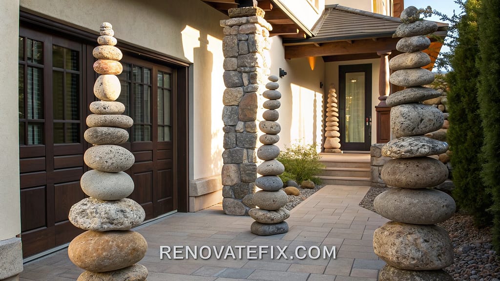 Establish artistic focal points through carefully balanced stone towers reaching skyward in graduated sizes.