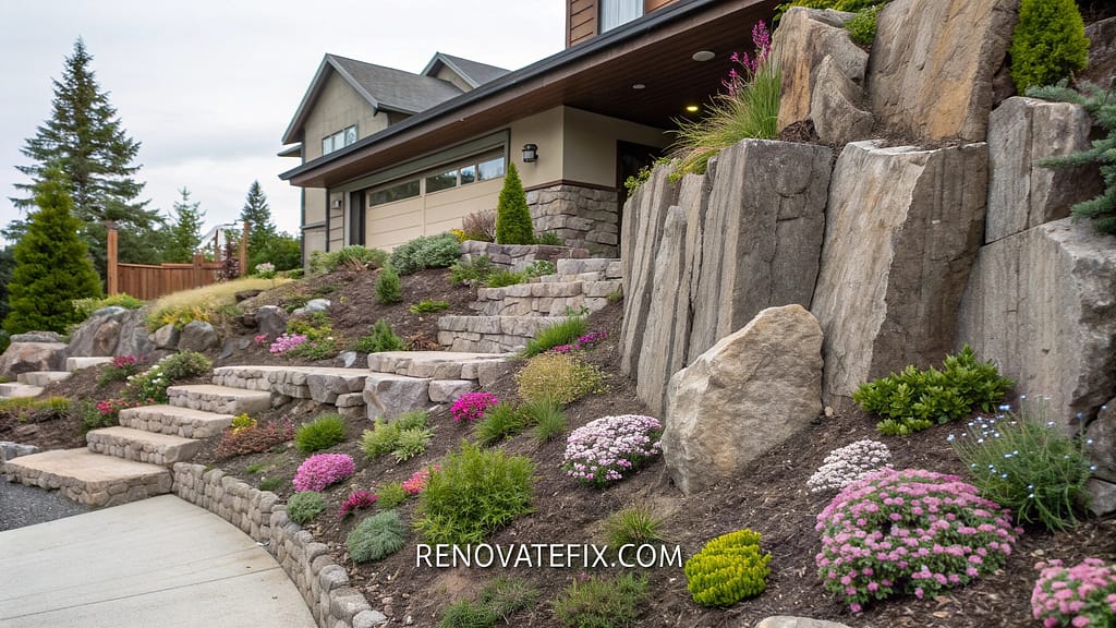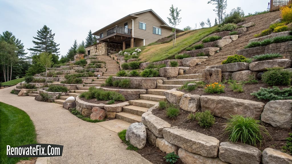 Address sloping terrain through stepped stone platforms creating usable flat spaces within challenging topography.