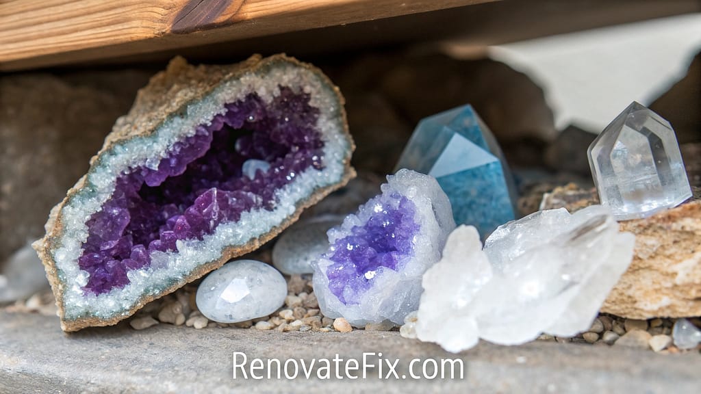 Display mineral specimens through carefully positioned geode sections revealing sparkling interior formations.