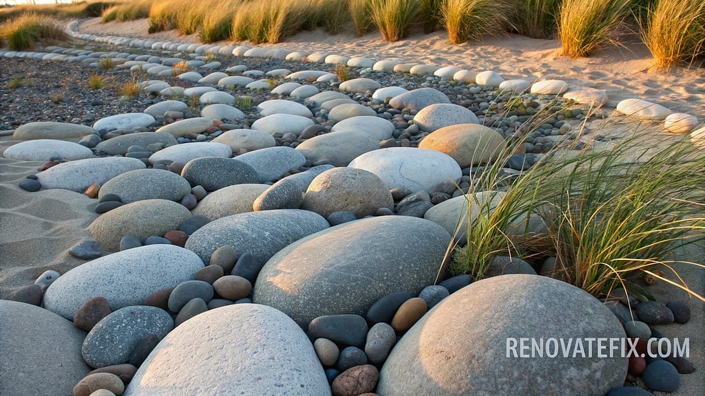Bring shoreline aesthetics inland through smooth, wave-tumbled stones arranged in gentle swales resembling tidal patterns.