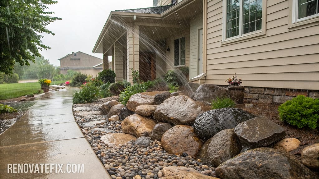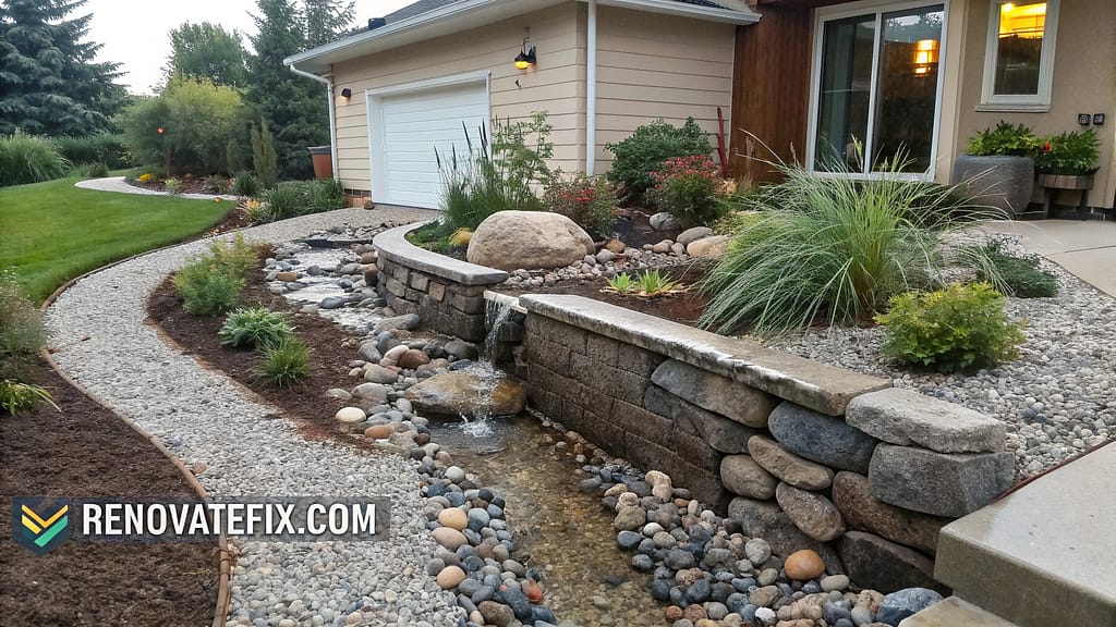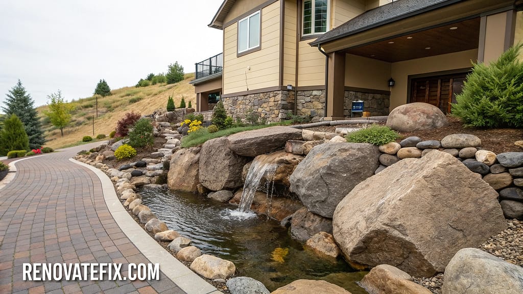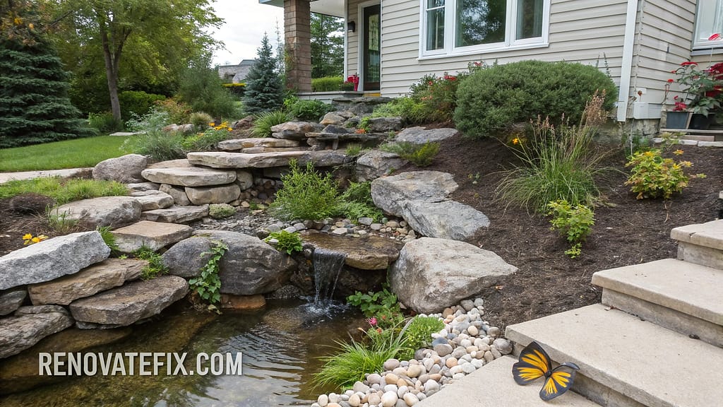 Address water management challenges through stratified rock layers capturing runoff from rooflines and hardscaped areas.